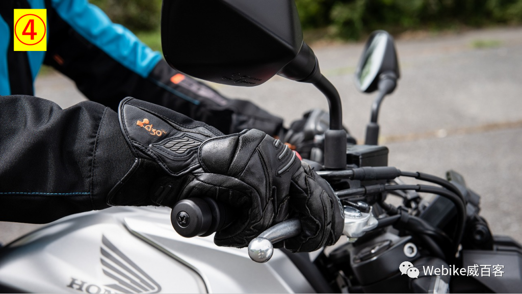 ▲油门归位后,使用食指与中指同时按下刹车拉杆,感觉就像是将手套的皮革轻轻放在拉杆表面滑动一样。