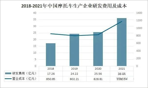 2021年1-11月,我国摩托车生产企业营业成本1180.34亿元,同比增长22.32%;税金及附加10.57亿元,同比增长16.48%;销售费用41.95亿元,同比下降4.65%;管理费用51.80亿元,同比增长1.86%;研发费用36.05亿元,同比增长17.95%;财务费用3.94亿元,同比下降85.23%。